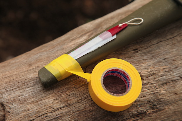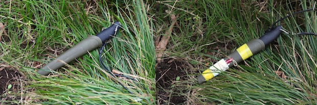 テープの有無での比較。テープは彩度の高いものと明度が高いものを巻いておくと、緑のなかに落としたときは彩度の高いテープが、暗いところでは白いテープが目立ちます