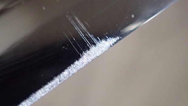 ひとつは「ホーニング」。粒子の大きさが異なる数種の砥石を使って順に砥ぎあげ、鋭角かつこすり傷のない鋭い刃先を砥ぎだします。もうひとつが「タッチアップ」。丸まった刃先をヤスリ状のもので削り落とし、細かい鋸歯状にすることで切れ味を戻します。