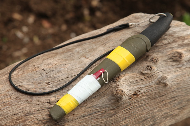 泳ぐ時に無くさないよう、着脱可能なバンジーでシースとナイフを接続。視認性を高めるテープを目印に