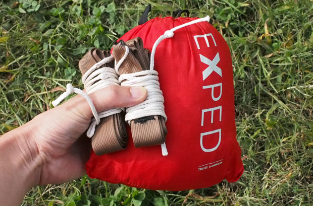 愛用のEXPEDのトラベルハンモックとハミングバードの張り綱セット。片手で持てるほどコンパクトだが、快適な寝床が、簡単に設営可能だ!