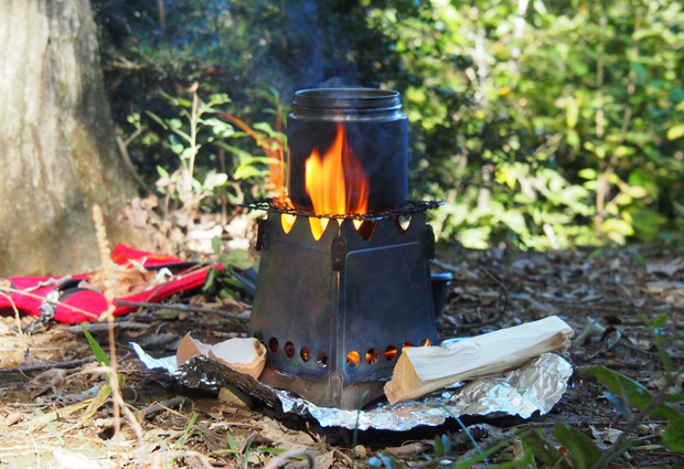 お気に入りのナイフを使うためにあえて火器はウッドストーブ。意外とハンモックとの相性が抜群だ。ハンモックに座りながら火をいじるのは至福の時間