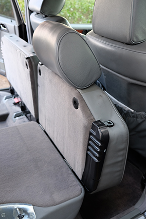 セカンドシートの座面をあげて背面を倒す。座面と背面に凹凸があって組み合わされ固定されるのでがたつかない