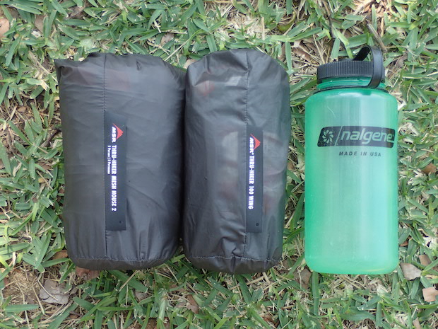 メッシュハウス2と100ウィング、それぞれをラフにパッキングしてもナルゲンボトル1ℓとほぼ同寸(きれいにたためばもっと小さくなる)。メッシュハウスはペグが付属した状態でも450gの重量を実現し、「スルーハイカー100ウィング」と組み合わせても実測で約1kg! 2人で使えば、一人当たり500g程度の負担で広い室内空間を得られます。