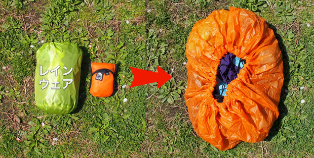 左がレインウェア上下とレインカバー。左がレインカバーの中にレインウェアを入れた状態。レインウェアのスタッフサックが不要になり軽量化。周囲の隙間に押しこむので、見た目ほど場所を取らずにパッキングが可能だ
