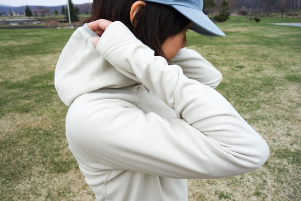 ジッパーをあげればフードは目だけを出して顔全体を覆うことができます。腕を深く曲げてもしっかり素材がストレッチしているのが分かりますね