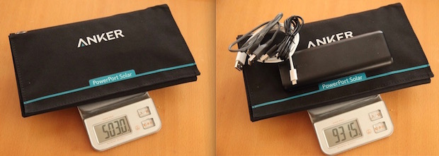 重量はパネルのみで実測503g。野外で使うことの多い電子機器への充電装備一式(モバイルバッテリーと付属のケーブル、iPhone、ヘッドランプ、コンデジ等のケーブル)を合わせても重量は931g。長い旅に持ち出す重量としてはギリギリ許容できる重さか。
