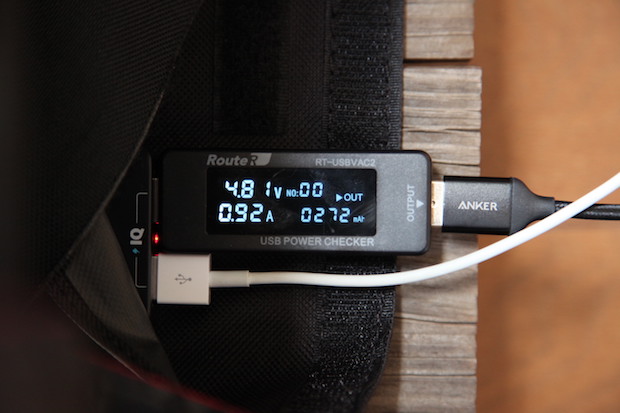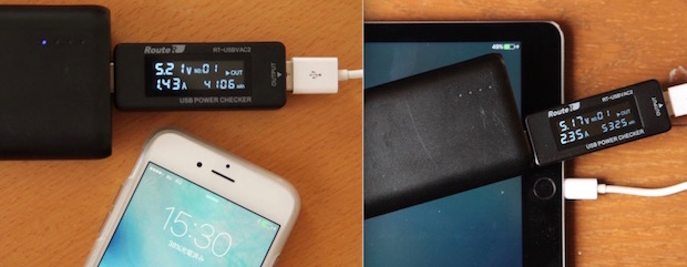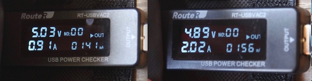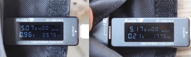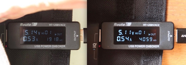 電圧、電流は別売のチェッカーで確認した。左側の写真が充電開始時で右側が充電終了後。チェッカーのモニターの見方は電圧Vが左上、電流Aが左下、右下の「mAh」は充電を開始してからの積算電流量を示している。充電開始と終了時のふたつのモニターを見比べると、5V前後の電圧が安定して得られており、バッテリーの容量がない間は1A前後で充電し、バッテリーがいっぱいになるにつれ電流の値が小さくなっていることが読み取れる。開始と終了の間までには1200mAhの電流がバッテリーに供給されている。