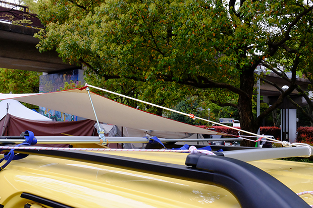ルーフキャリアにポールを固定して、そのポールにタープを固定するためのセンターポールを立てている。しっかりしたDIY。どきどきはする