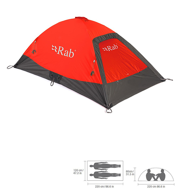Rabのウエアで実績のあるeVent®3レイヤーファブリックをテントに使用することで、軽量だが結露しやすいシングルウォールテントの弱点を解決した。ペグやポール、収納袋を合わせても 1.5kg 以下という軽量性を保ちながら、9.6mm DAC Featherlite NSLポールを採用するなど、耐久性にも優れているという。