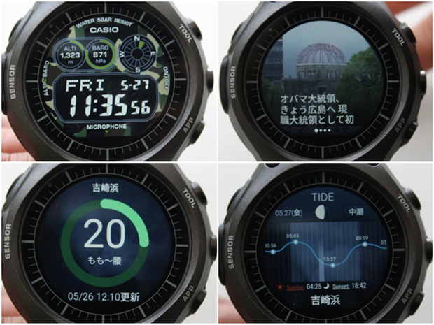 ここまでは、普通のスマートウォッチでもできることかもしれない。これだけでも十分便利だし、人前で時計を指でスワイプしたり、時計に話しかけてると「なにそれ~」「すごーい」とモテモテになること請け合いなのだが、カシオのコレはさらにアウトドアに特化した機能も満載なのである。ネーミングがスマートアウトドアウォッチというんだからそりゃそうだ。