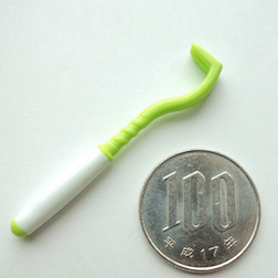 これは小さい方のティック・ツイスター。100円玉とくらべてもこの大きさ。あまりに小さく、なくしてしまいそうです。まるでおもちゃの釘抜きのような形ですが、これをマダニと皮膚との間に差し込み、持ち上げながらくるっと回せばあら不思議。スッとマダニを引き抜くことができるという簡単さ。なにしろ