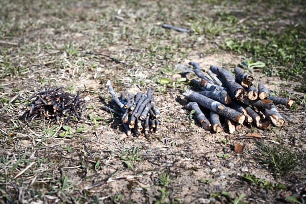 まずは燃料集めだ。「こんなところにタケノコがあったのか」と通い慣れた山道での新たな発見。薪を集めるということは、さらに自然の中に一歩踏み込む行為なのである。さて、このように3種類の太さの薪を用意した。