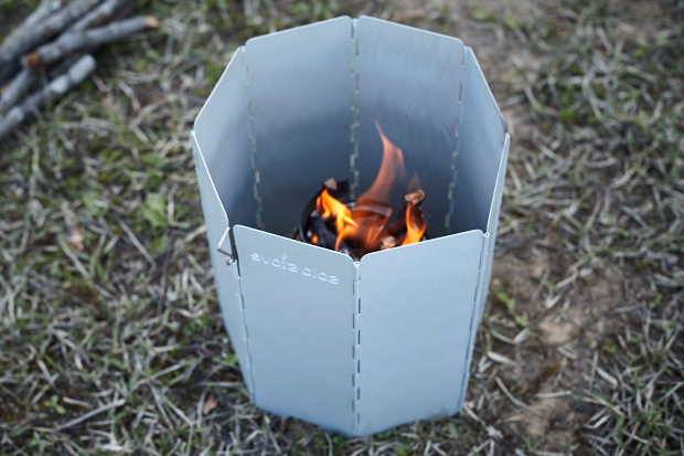 風が強いときは別売の風防があると心強い。火の持ちもよくなり、少ない薪で効率よく調理ができる。使わないときはまな板にもなるしね。