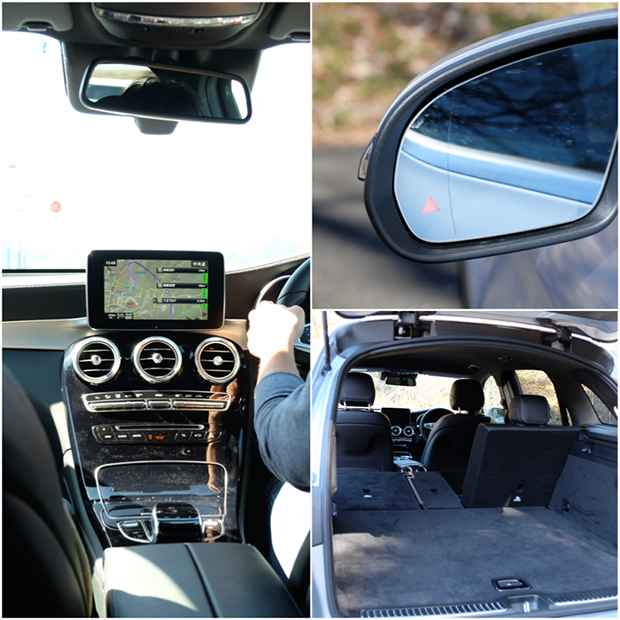 左)自動追尾システムを生かして手を離した写真はどうも気が引けるので、コックピットの写真でご勘弁。右上)車線変更するときに死角が生まれてひやっとした経験をした人も多いはず。その死角を補ってくれるシステムがこれ。△の注意マークで知らせてくれる。右下)ラゲッジはもちろん十分な広さ。ちょっと段差が気になるかなぁ。もしクーラーボックスをガンっと突っ込んだら、、、、