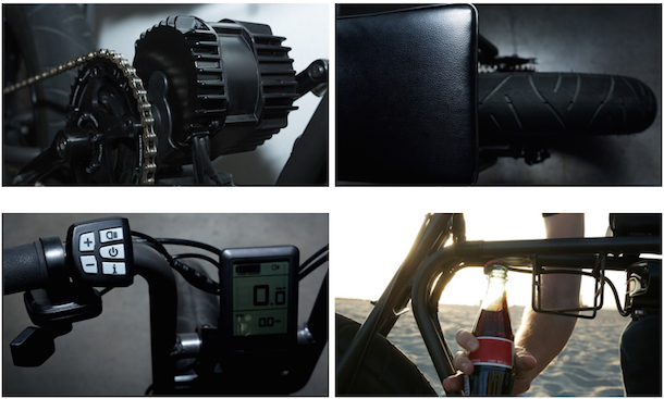 第一印象ではやたらかっこいいバイク風の自転車にしか見えません。こんな四角いシートで漕げるのかと思いながらよくよく見れば、どうやらモーターらしきものが! そして細部を見るにつけ、なんじゃこりゃああああ!とそのデザインセンスに感動していくことになります。Kickstarterのページもとにかくオシャレで見やすい。わかってる人たちが作ってる雰囲気がぷんぷんしてますよ(画像はThe Super 73 by Lithium Cycles [https://www.kickstarter.com/projects/782844499/the-super-73]から引用)