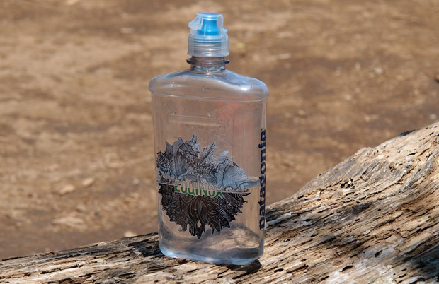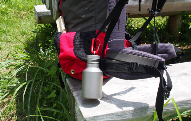 普段は、カラビナを取り付けられる小さめの金属ボトルを使用している。金属ボトルは耐久性がありゴミが出ないのが良い。バックパックのショルダーハーネスにカラビナで取り付けると、多少歩くとブラつくが、取り出しやすく、体に密着する位置で重さを感じにくい。夏は保冷機能のあるダブルウォールのボトルに変えている。