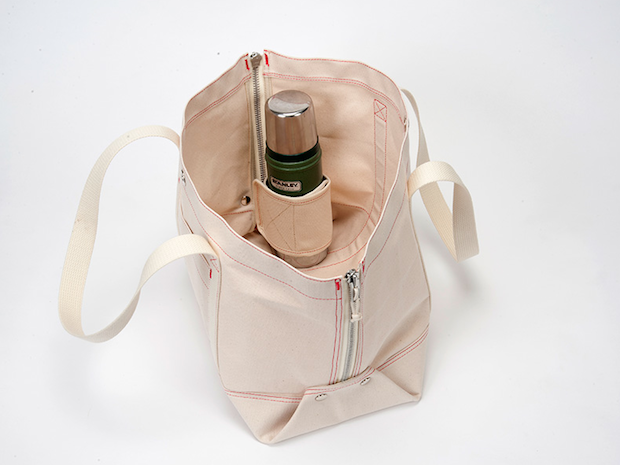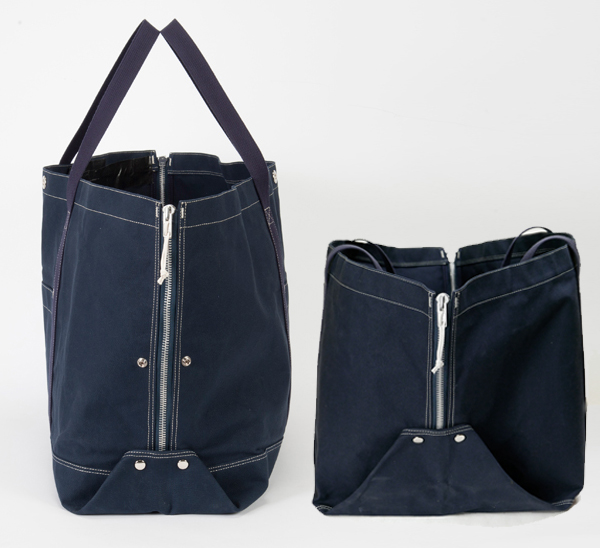 一見、普通の大型トートに見えるが、両サイドにファスナーが施され、マチの折り返しはスナップボタンで止める仕様。ボタンの位置が2段階設定してあり、荷物によってマチの広さも変えられる。ちなみに、このタイプだとボトムの形状を約40cmの正方形にも変形できる。