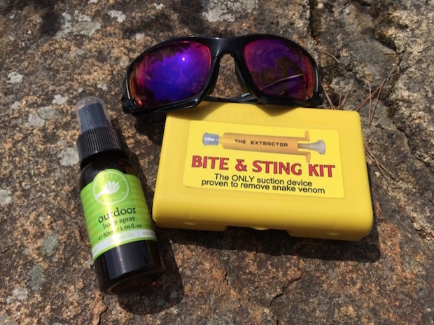 で、こちらが夏山虫除け三種の神器、サングラス、虫よけスプレー、そしてポイズンリムーバー(商品名は、エクストラクター)。