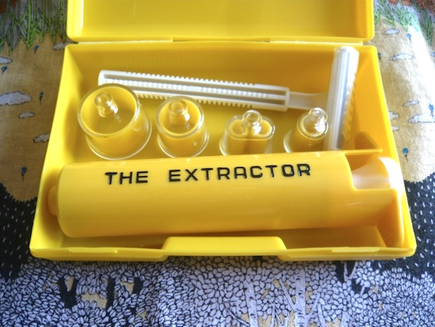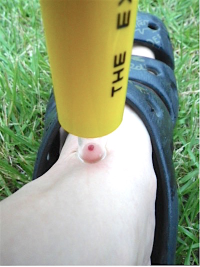 このポインズンリムーバーのいい点は、片手で操作できるところにある。一度バーを持ちあげれば、手を放しても患部をポコっと吸い上げ続けてくれるのだ。