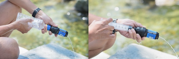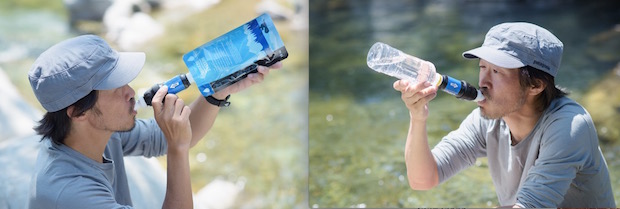 「SP131」のもうひとつの浄水方法は、いわば「ボトル式」。フィルターに0.5Lパウチや使用後のペットボトルと直結することで、ボトル式浄水器と同じような仕組みできれいな水を得られるのだ。