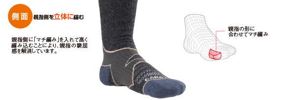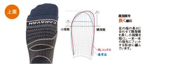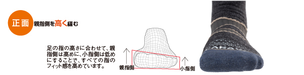 登山用ソックスには、右足のカタチと左足のカタチそれぞれに専用設計になっているモデルもあります。そもそも人間の足のカタチ自体が左右非対称になっているのだから、ソックス自体もその形状に合わせてしまおう!! という発想はごもっとも。もちろん、モデルにもよりますが、親指のほうが長く小指ヘ向かってゆるくカーブをつくることで、足へのフィット感が格段に上がっていきます。