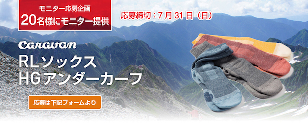 さてさて、登山用ソックスの話に終始してきましたが、ここで耳寄りの情報をひとつ。老舗登山靴メーカーとしても名高いキャラバンが、自社で開発した登山用ソックスのモニター応募企画を実施しています。
