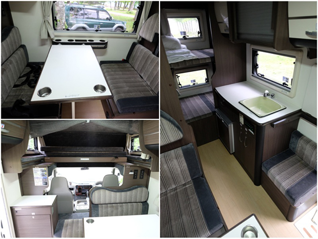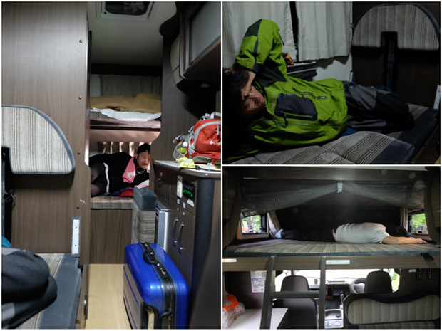 左上)リビングスペースは少々きつめだけれど、きちんとくつろげる。左下)運転席の上に覆い被さっている部分もベッドになるのだ。右)簡易上下水施設があって、その奥が2段ベッドになっている