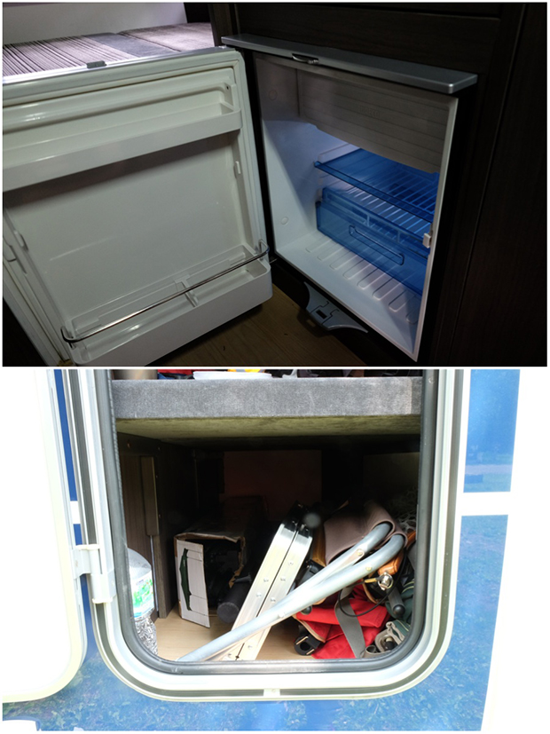 上)常に冷えたビールが飲める幸せ! 下)キャンピングカーはいろいろなデッドスペースをいかして収納スペースがある
