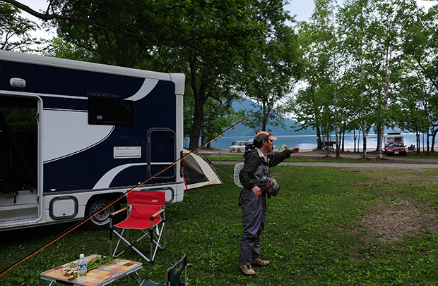 キャンプ場についてすぐに夕間詰めに間に合うように釣りの準備。設営いらないから超楽♪