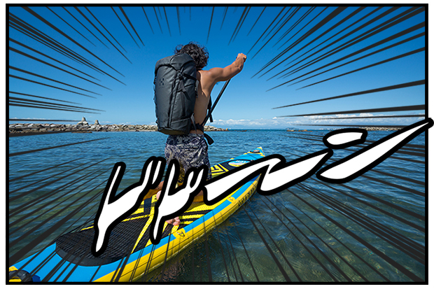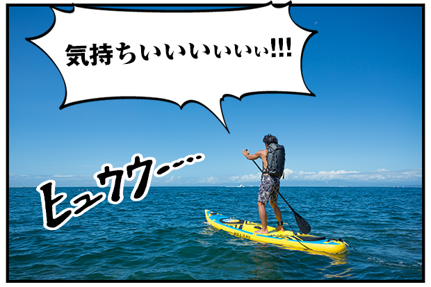 よく晴れたいい朝だぜ。今日も暑くなりそうだな。俺ん家から会社までは、海を渡るのが手っ取りばやいんだ。つうことで、まずはサップで海へ漕ぎ出そう。ちなみにサップってのはスタンドアップ・パドル・ボードのことさ。なんでサップっていうのかは俺も知らねー。