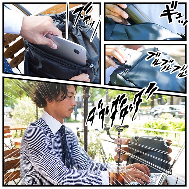 今日は、出先で仕事だ。KATLAには、15インチのラップトップパソコンが収納可能なスリーブが搭載されている。しかも、主気室の外側にあるので、雨蓋だけオープンすれば取り出せるので便利だ。それに、雨蓋、本体両サイドにもファスナー付きのポケットがある。雨蓋の方には、財布や名刺入れ、手帳、キーなどの小物を入れておけるし、両サイドには折り畳みの傘やボトルも入れておける。なんとも気の利いたバックパックだぜ。仕事もはかどることこの上なしだ。