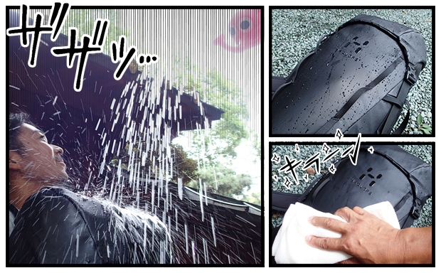 でも、俺はちっとも焦らないぜ。KATLAの生地は水が浸み込まないターポリンだからな。おっ、雨がしのげそうな神社があったぞ。雨宿りしていくか。ちょっと軒先きお借りします。