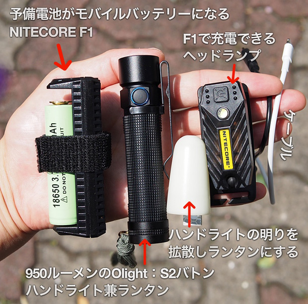 同じナイトコア社から新しく出た充電も給電もできる「F1」も新しく購入し、ライトシステムを再構築してみた。最高950ルーメンの強力ハンドライトと、その予備電池をモバイルバッテリーにする「F1」、で今回紹介したヘッドランプ「T360」も。携帯電話も充電できるようになった。