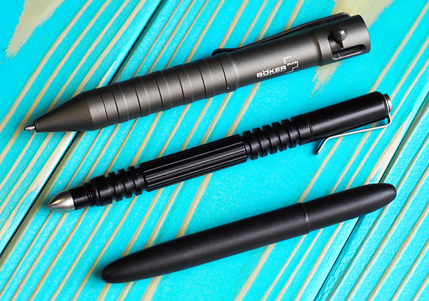 オフィシャルだけではなく、他社からもデザインに凝ったペンが発売されている。写真上のペンは、独ボーカー社のボルトアクションボールペン。ボルトアクションしないとペン先が出ないので、ポケットに入れていても安心だ。写真中のペンは、米Rick Hinderer Knivesのデザインしたボールペン。ナイフがカッコいいならボールペンをデザインさせてもカッコいい。こちらはスクリューキャップ式で出すのは一手間だが、しっかりとキャップできる。