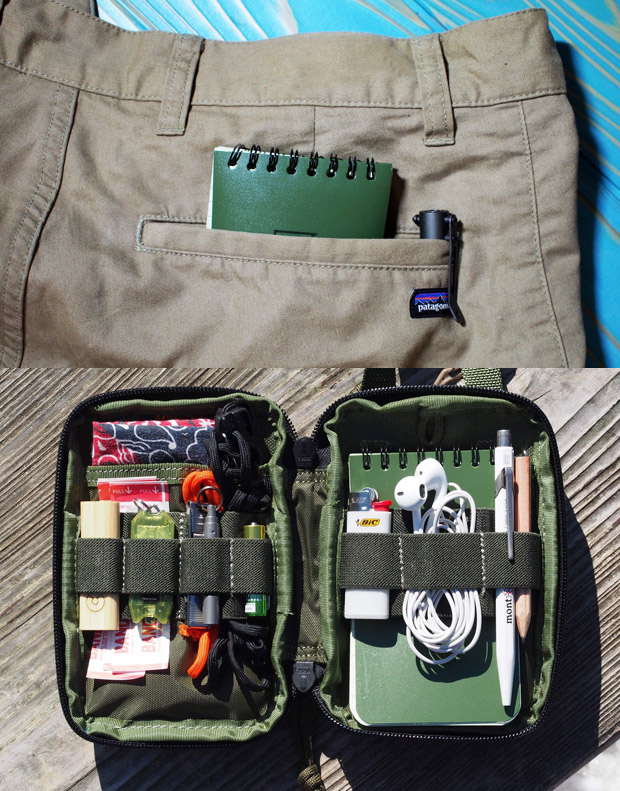 普段はクリップ式のボールペンと防水ノートをパンツのポケットに直接入れている。すぐにメモを取れて、すぐにしまえる。メモを取ることがない日はEDCポーチに入れることもあり