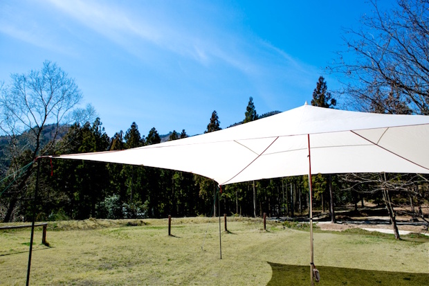 そのネーミングのとおり、「青空のもと、開放感いっぱいに自然と親しみやすい構造を追求すること」をテーマにしたタープで、具体的には張り綱を極力少なく、四辺対称の形状でどこからでも出入りができて、かつセンターポールを設けることで人の集まりやすい中心地を生み出すこと、などなど細かな部分を考え抜いてつくられたもの。