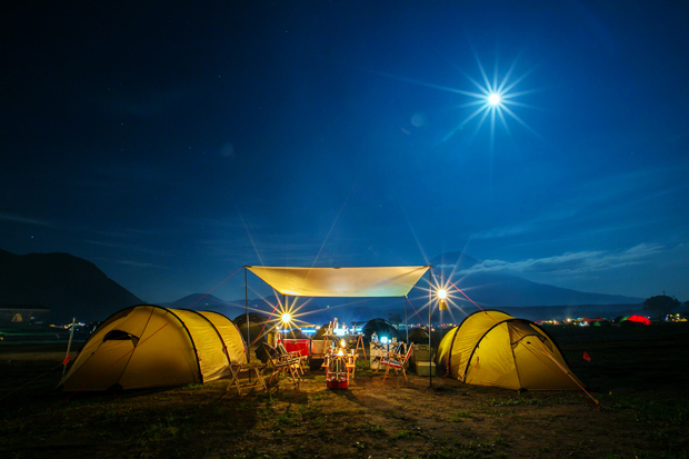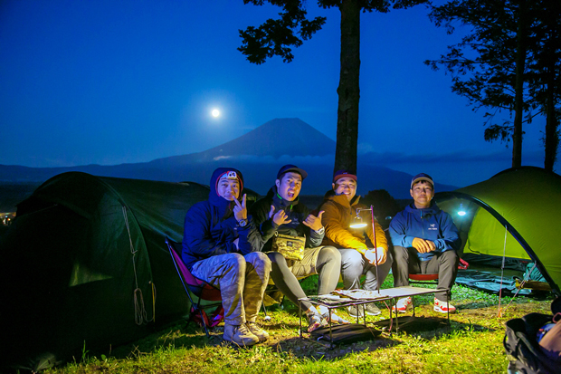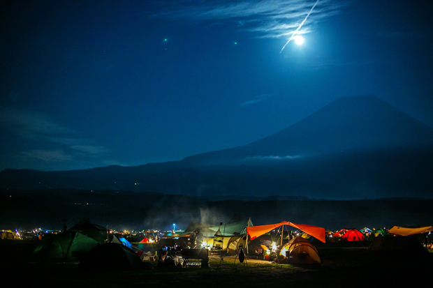 富士山の肩からのぼった月がとても明るい。暗闇に灯ったテントが浮かびあがる。