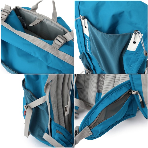 またメイン気室とは別に、ほか背中側にはハイドレーションスリーブ、正面とサイドにストレッチポケット、ウェストベルトにも小型ポケットが装備されています。正面のポケットは大きく、今回は頻繁に取り出すものだけ別の防水スタッフバッグに入れて、正面ポケットに収納して使いました。濡れたレインウェアなども難なく突っ込める充分な大きさがあります。