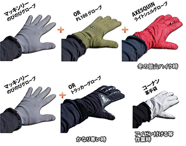 普段使っている靴下を履いて登山靴を選ぶように、普段使っているインナーグローブを付けてからグローブ選びをすると良いと思う。