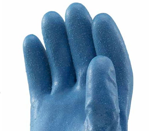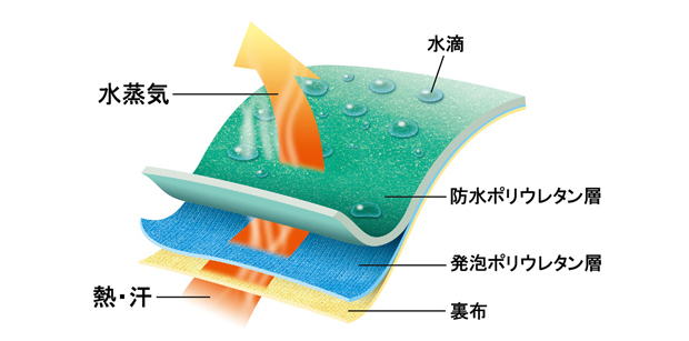このグローブのポイントは、なんと「透湿性」を備えている点。水色の部分が特殊なポリウレタン樹脂でコーティングされ、水作業や洗剤液のなかでもまったく手を濡らすことなく作業ができる完全防水仕様でありながら、内部に篭った湿気はしっかりと外へ放出されるという特徴があります。