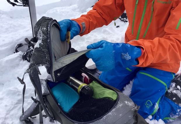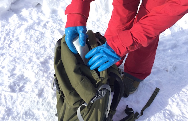表地には写真のようにツブツブの滑り止め加工が施され、立体的な構造や柔らかくて薄いポリウレタン素材のおかげで、作業性が抜群にいいのも特長です。滑りやすいスノーシューのストラップを引いたり、ポケットのなかのサングラスを取り出したり、バインディングの微調整をしたり……と、ついグローブを外して作業しがちなさまざまなことが防寒テムレスを装着したままでもじつにスムーズ。