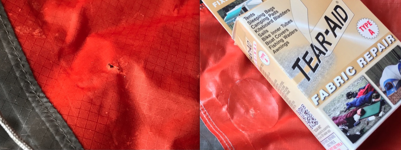 生地は内容物の保持には十分な強度があるものの、硬いものを入れた状態で岩などに擦るとピンホールが空くことはありえます。カメラやハードケースなどを入れる際は、衣類などで包んでおくと穴があきづらくなるでしょう。万が一ピンホールが空いた場合は、リペア用のパッチを裏側から貼ることで手軽に補修できます。私はいつも数平方cmに切り出したパッチを同封しています。