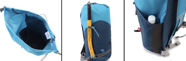 左)防水性を保つためメインコンパートメントの口はロールトップ式を採用 中)本来はクライミング用というわけで、サイドにはアックスループを備えています 右)そして反対側にはボトルホルダーも。こうした装備が、このパックの汎用性を高めています