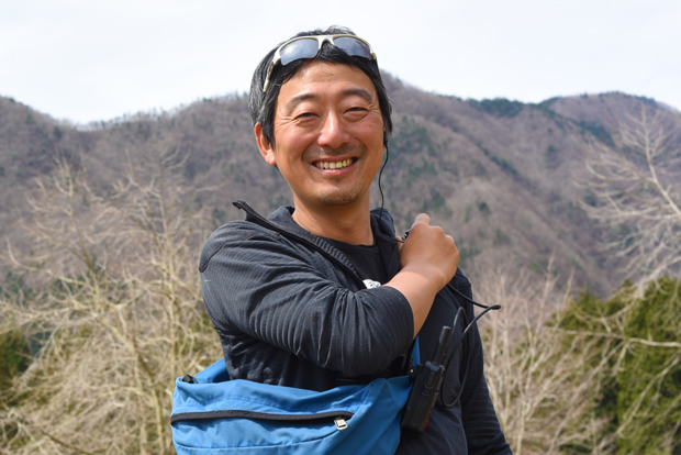 使い込まれたカスケードと岡野さん。山中でのロケのときは、こんなスタイルでいつも行くという。