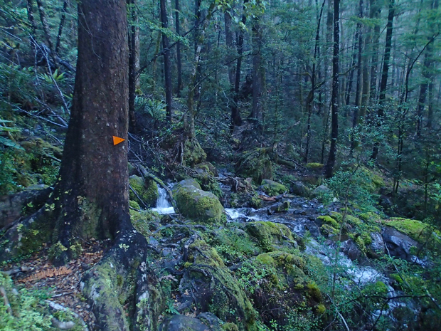このような雰囲気の場所が多い、ニュージーランドのトレッキングルート。オレンジのマーキングが行き先を示している。©naomi.s