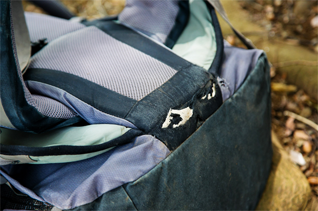 いかに重いものを背負っているのかを感じさせる。荷重がかかる腰の部分にはほころびが。
