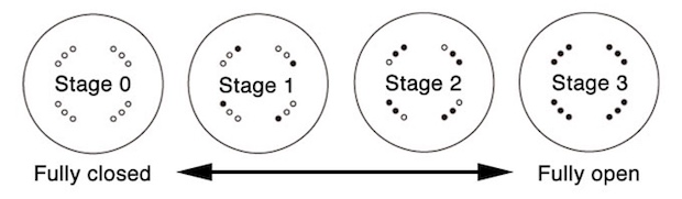 ドリッパーのホールは4つの状態から可能。いちばん左は蒸らしなどに使える全閉状態。なので、実際のドリップには3種類のホールサイズを選ぶことができます。調整はドリッパー事態を回すだけでOK。スムースに回り、かつコーヒーが垂れてこない工夫がなされています