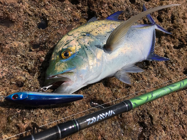 遠征中、もっとも良いポイントで、ルアーを追って飛び出してきたのは平アジ。ルアーをくわえた刹那、竿をあおって針をかけ、岩陰に走られる前にゴリゴリ巻き上げる。