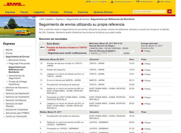しかし虎穴に入らずんばビッグフィッシュを得ず。少々のトラブルは覚悟のうえで注文するとスムーズに処理された。国際輸送サービスのDHLで番号を追跡すると、バルセロナからドイツのライプツィヒ、香港を経由し、ぐいぐい日本へ向かってくる。わくわくする。