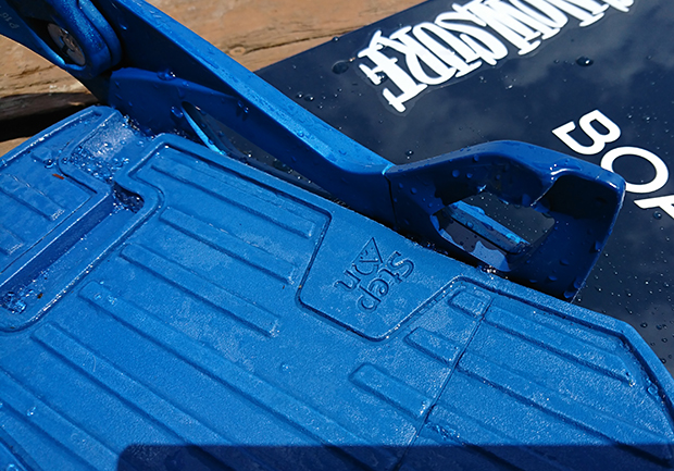 トウ側のフックは踏み込むことでバチンと噛む。先に固定しなくても、ヒールが固定されていれば滑りだしてから軽くオーリーして着地すればそれで噛ませられる